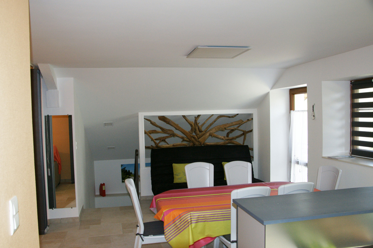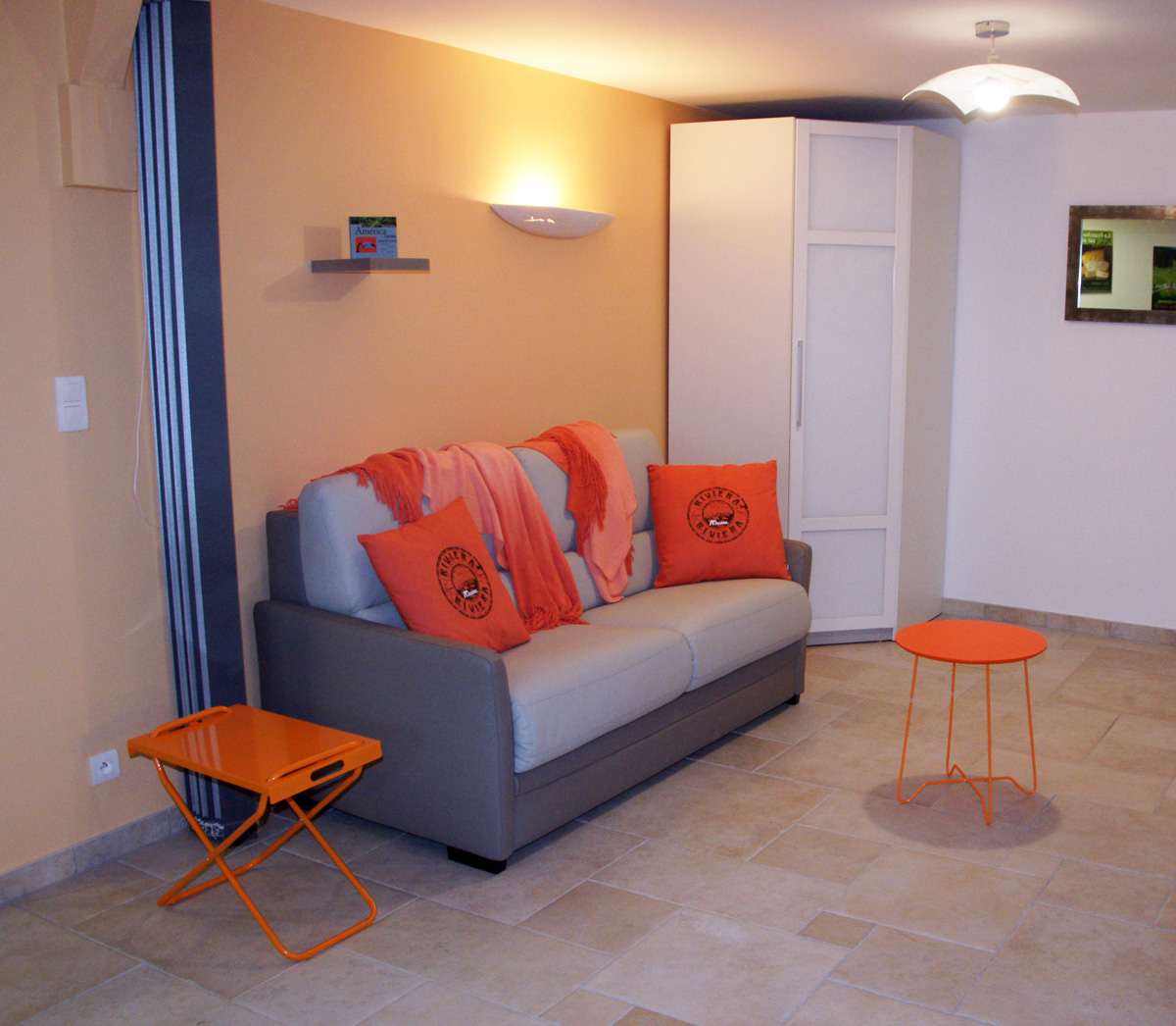 Couchage 1 lit 160X200 ou 2 lits 80X200, canapé convertible 2 places (140X190) et canapé clic clac. Lit bébé ou enfant et réhausseur à la demande.